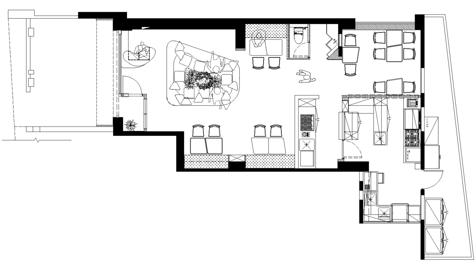 入口牆面以大地色系與自然質材揭開序幕,象徵「土壤」與「樹木」的原始狀態,讓人從踏入空間的第一刻,便逐漸抽離城市的節奏。隨著動線向內延伸,植栽與仿天井光膜交織出如林間灑落的光影層次,讓光線、綠意與動線層層呼應,勾勒出一段由城市漫步森林的過渡體驗。在喧囂之中,構築一個讓人久待的角落。