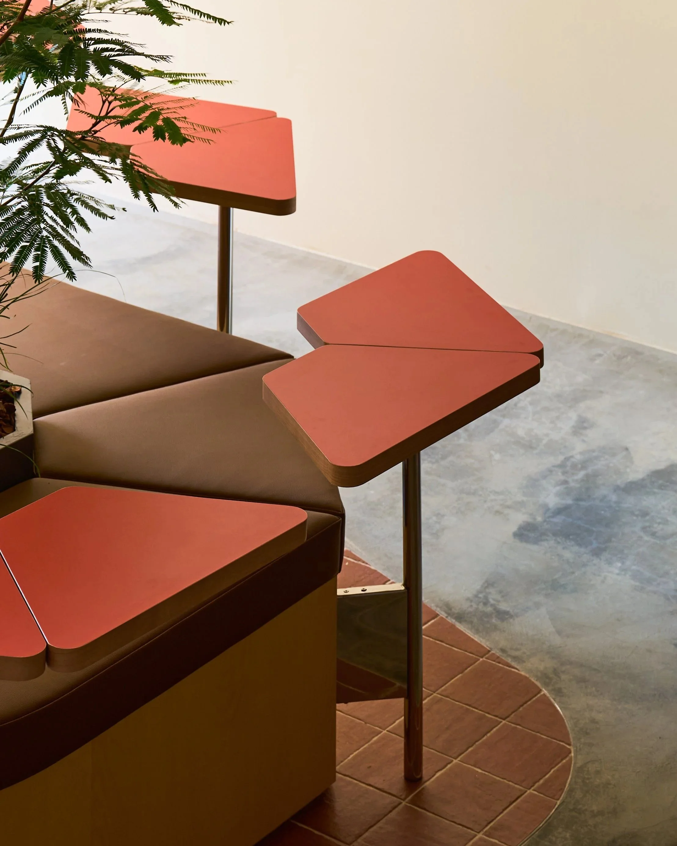 入口牆面以大地色系與自然質材揭開序幕,象徵「土壤」與「樹木」的原始狀態,讓人從踏入空間的第一刻,便逐漸抽離城市的節奏。隨著動線向內延伸,植栽與仿天井光膜交織出如林間灑落的光影層次,讓光線、綠意與動線層層呼應,勾勒出一段由城市漫步森林的過渡體驗。在喧囂之中,構築一個讓人久待的角落。